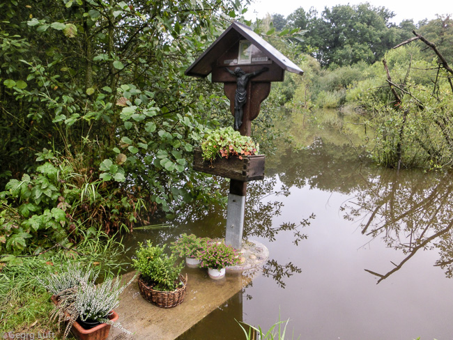Das Flurkreuz ist abgesoffen. Wenigstens müssen die Blumen nicht mehr gegossen werden.