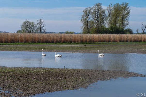 Die Schwäne formen einen gemütlichen Dreier, der Hase nimmt Reißaus.