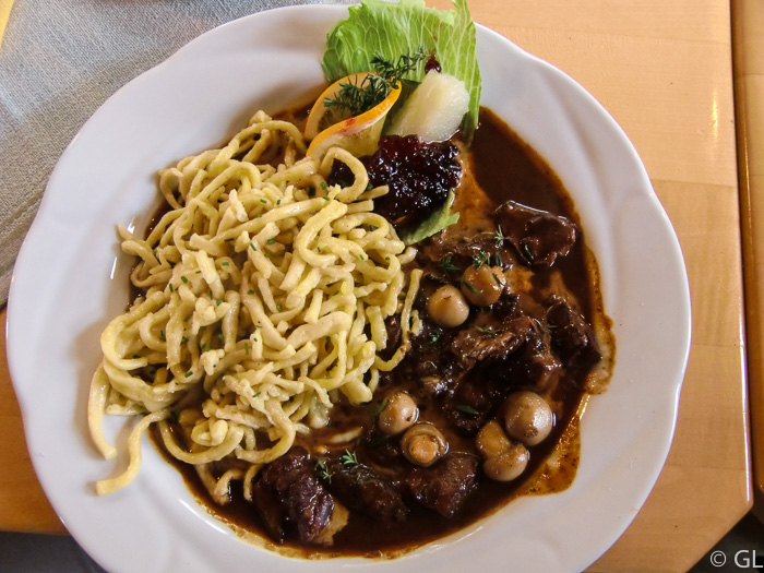 Hirschgulasch. Traumhaft lecker. Eine win-win-Situation für Wirt und mich - nicht aber für den Hirschen.