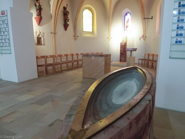 Das Taufbecken war erst am Tag zuvor in der Zeitung abgebildet gewesen. Da war es noch voll Wasser.