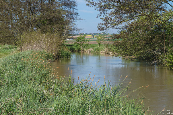 Öha, die Große Laaber laabert ganz schön kräftig. Hinten Aufhausen mit Wirtshaus und ein bisschen Kirche...